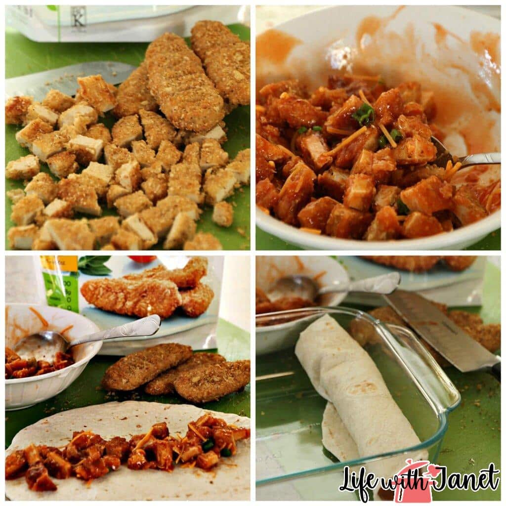 - Combine crispy tenders, cheese, buffalo sauce and onions in mixing bowl. Evenly distribute between flour tortillas spreading mixture down the middle. Roll tortilla up and place seam side down in 8×8 in glass baking dish. Spray tortillas with Pam spray. Sprinkle with sea salt.