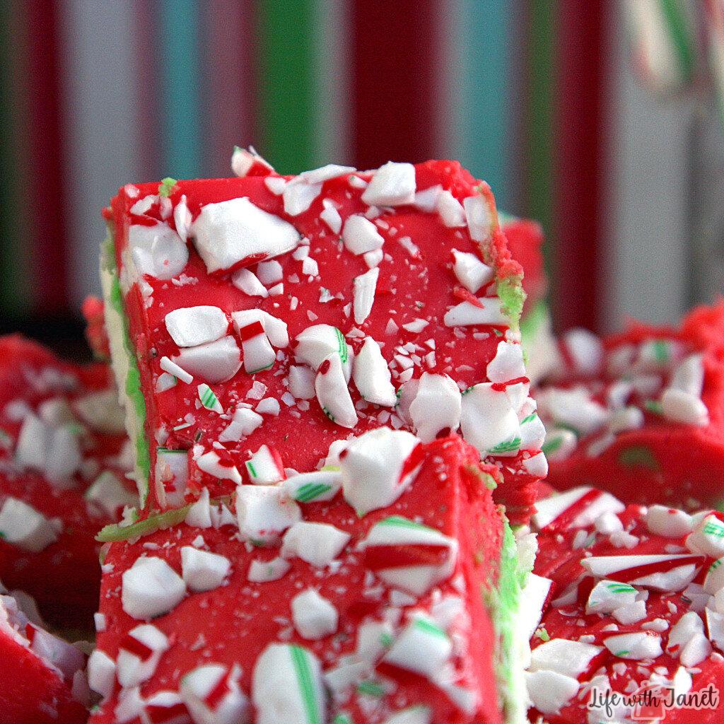 - Divide amongst 3 bowls. Dye one batch of fudge red, one batch green, and leave the last white. Pour the white layer into the prepared pan, followed by the next two colors. Top with crushed candy canes, and then cover and place in fridge to set for at least 4 hours. Cut into squares and serve.