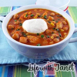 Crockpot chili for the season with pumpkin, chicken, corn and chickpeas. The pumpkin elevates an everyday, mundane chili into something exciting.
