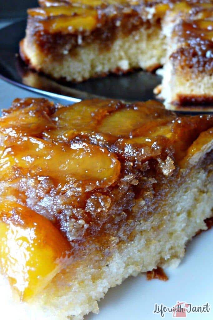 When you flip Peach Upside Down Cake out of the cake pan, Be Careful! It will be hot and I have had a disaster when it slid off the plate I was turning it onto. Take your time and grasp both the pan and the plate together. There will be plenty of time to lift the cake pan off after you’ve done the flip.