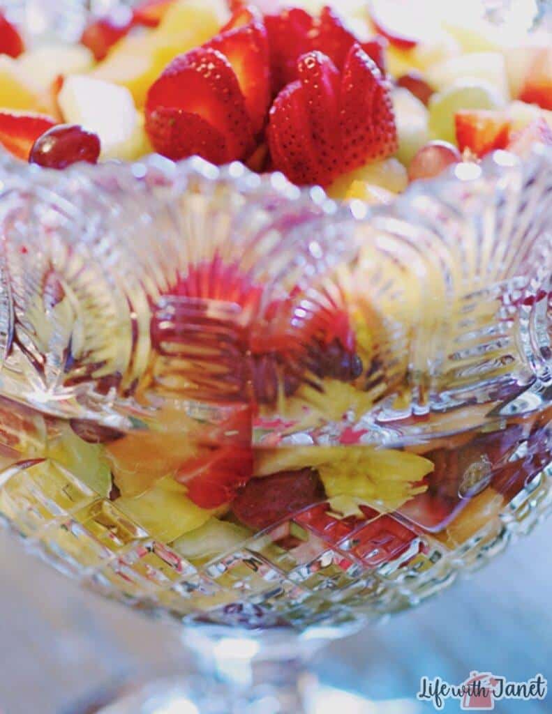 - In extra-large crystal (or decorative) serving bowl, add chunks of fruit, mixing fruit as it is added to bowl until fruit is within one inch from the top of the bowl. Using the reserved, whole strawberries, make a garnish by placing each whole strawberry into an egg slicer and applying pressure until the strawberry is 3/4 sliced. Repeat for the remaining strawberries and “fan” each cut strawberry between your fingers as if you are spreading a hand of playing cards. Arrange each strawberry on top of the fruit salad as garnish.