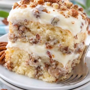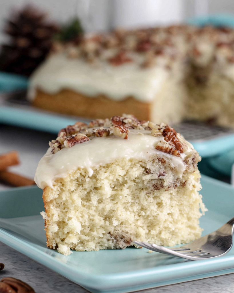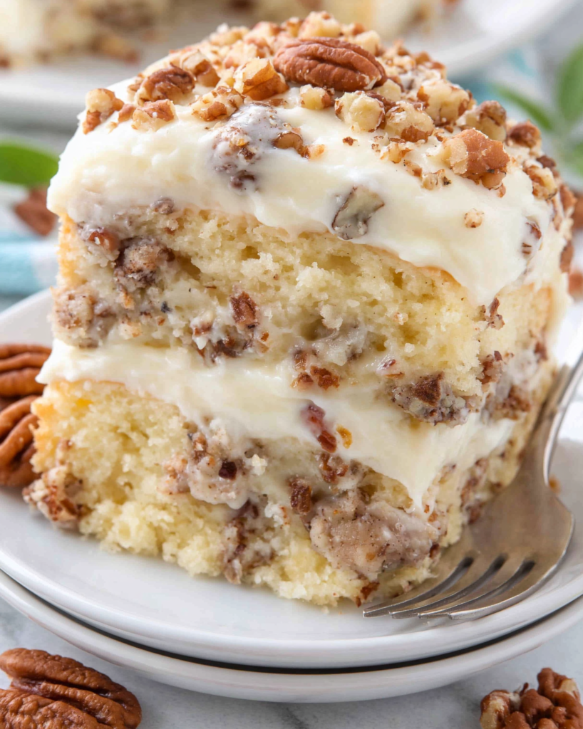 Absolutely! Pecans are the traditional choice and they add a wonderful buttery, slightly sweet flavor. But walnuts work really well here too. If you have a nut allergy or just don’t love nuts, you can simply leave them out and the cake will still be fantastic.