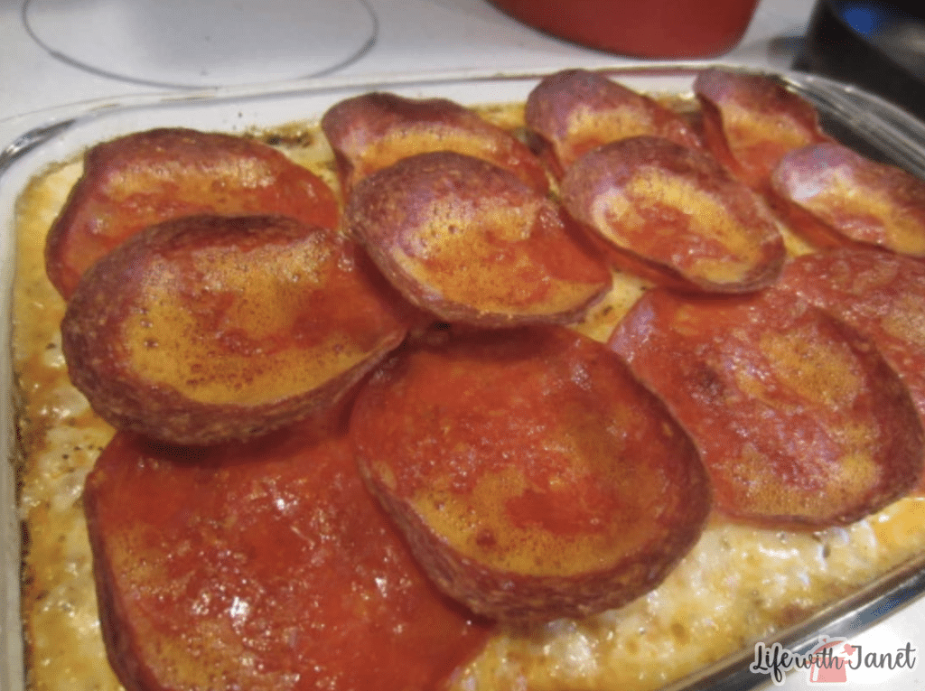 - Remove the dish from the oven and add your toppings–sprinkle extra meat, veggies, cheese, and whatever else directly on the casserole, and make sure you add the pepperoni last, so it seals in all the flavor and makes a nice little “crust” on the outside.