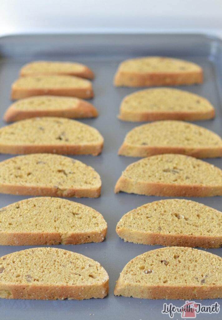 - Bake biscotti rolls for about 30 minutes, then remove from oven and allow rolls to cool on a wire rack for about 10 minutes. Slice each roll into about fifteen 1/2 inch slices and place slices back on cookie sheet, cut side up.