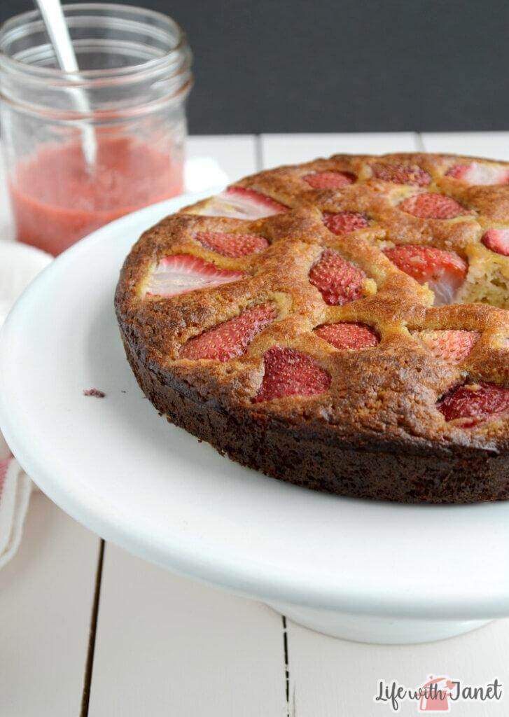 - Pour batter into a well greased and lined (with parchment paper) round baking pan, and top with the sliced strawberries. Bake until an inserted toothpick comes out clean, about 30-35 minutes.