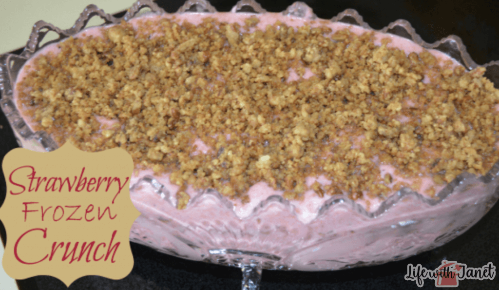 This is definitely one of my all-time favorite desserts! Frozen Strawberry Crunch reminds me of a more ‘mature and formal’ version of those strawberry crunch bars I ate as a child in the summertime. I have had this on my ‘to bake’ list for the past two months and couldn’t wait to share it with all of you! So, while visiting my parents, I ‘talked my mom into’ helping me make this for dessert (which was not too difficult). Even my dad who “doesn’t really like strawberries” had a few servings. Our boys loved it and it even made Big Brother’s list of ‘God, thank you for__’ prayers that evening! Caution: If you like strawberries, this dessert may be especially dangerous for you!