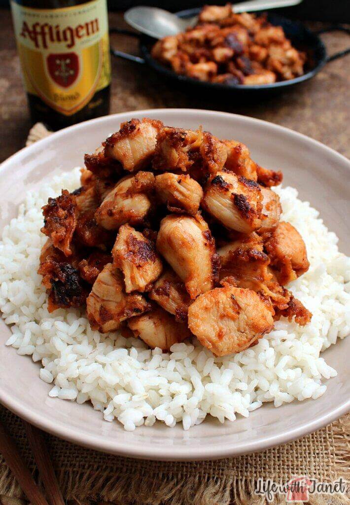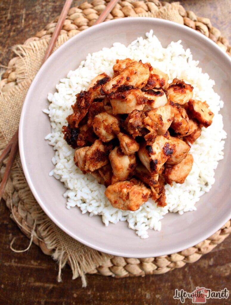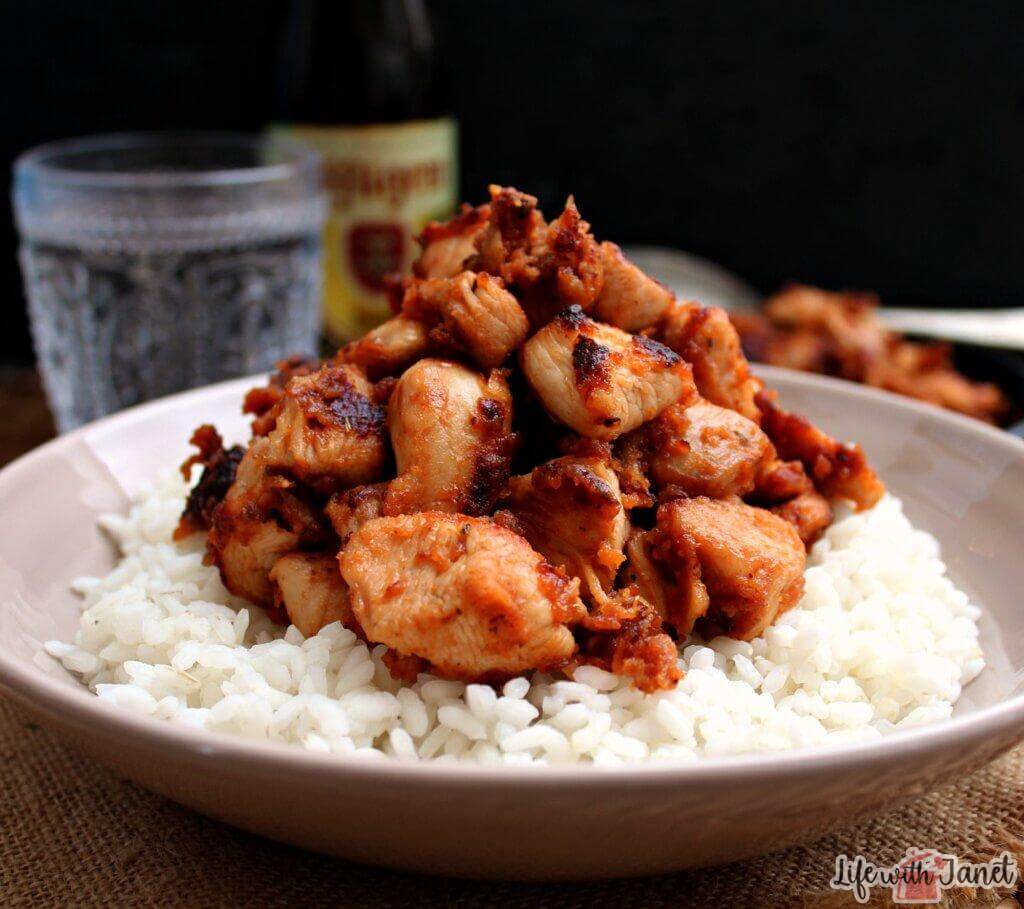Sticky BBQ glazed chicken bites.