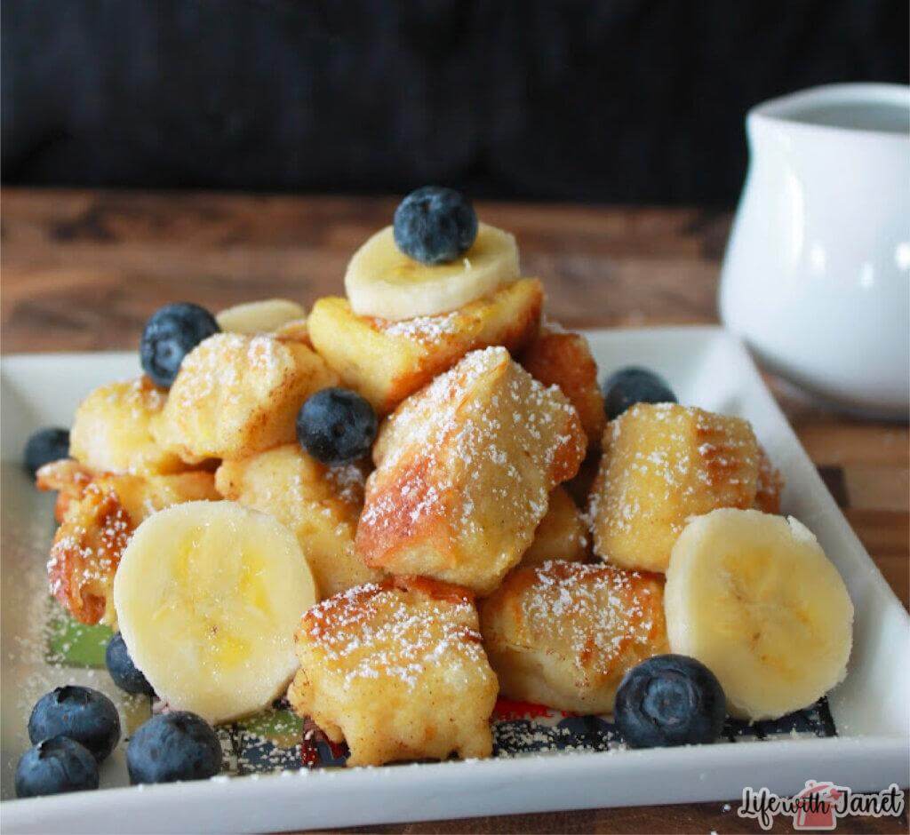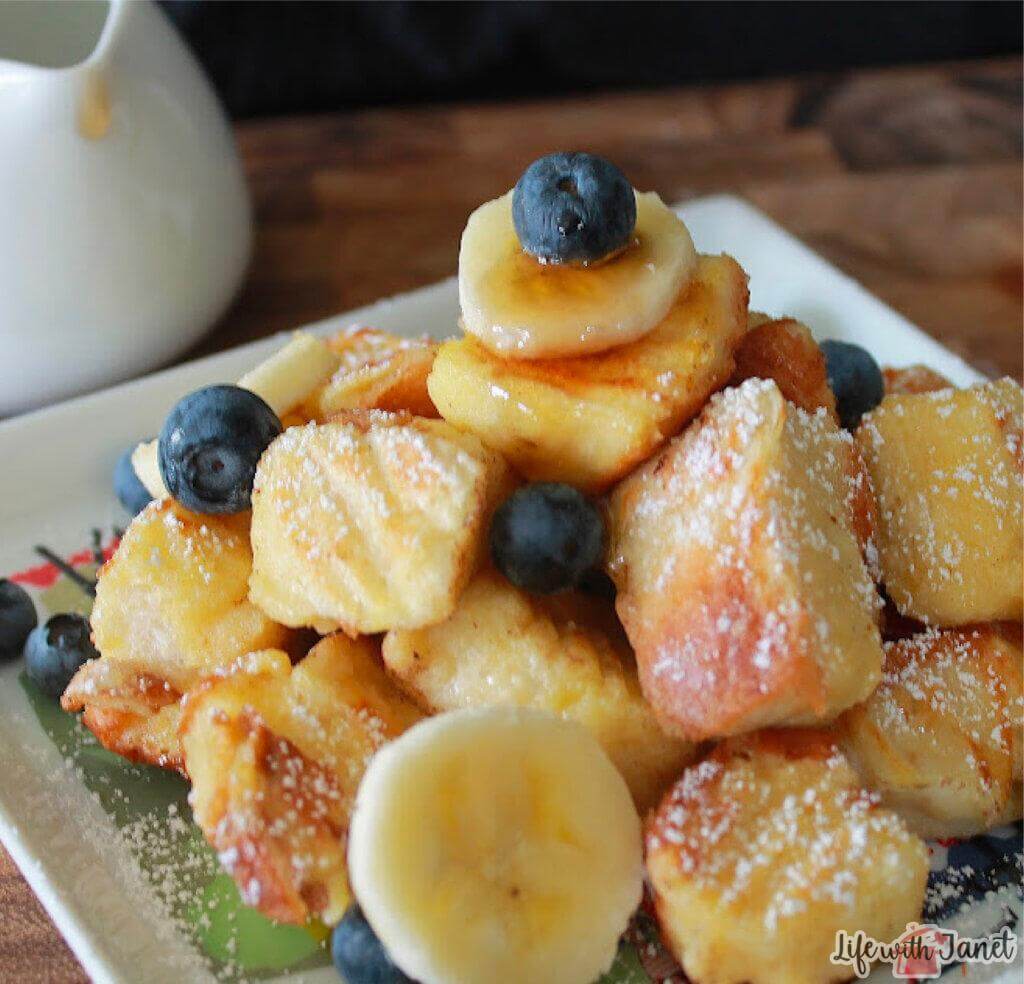 I am obsessed with the idea of brunch. My husband always makes fun of me for it because he doesn’t really understand why it wouldn’t just be called lunch. Every time I use the word “brunch” he responds with “oh, you mean lunch?”. I suppose I love it because it gives me an excuse to eat some of my favorite foods later than usual. And something about the word also makes it okay to have an alcoholic drink before noon because it’s a fancier meal, right? Anyway, breakfast, brunch, or lunch, call it what you will, I love breakfast foods and could eat them at any hour. My favorites are the carb-loaders: waffles, pancakes, french toast… I think I have a mild addiction to these three foods because I honestly can never have just one. I don’t know that I ever have. In fact when I was young teenager, my brother and I would have pancake eating contests. Those were the days when we couldn’t keep up with our metabolisms and we were skin and bones regardless of what and how much we ate. So I think my stomach still braces itself for these foods when it sees them coming because I can still put them down like a teenager. My husband and I always say we have a “second stomach” for foods like pancakes, ice cream, cake, etc. Moral of the story is I love them and can’t get enough of them. I created this recipe on a whim for aย brunchย that we decided to host last minute. I loved the idea of making everything bite-sized to make it easy to grab a few of everything. And obviously I loved the idea of french toast. Sprinkle with powdered sugar and drizzle with a bit of syrup and these little numbers are guaranteed to please any breakfast or brunch table.