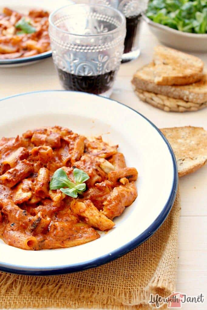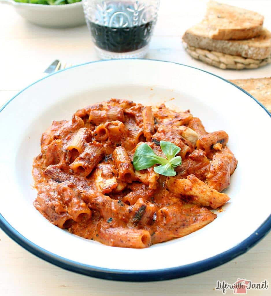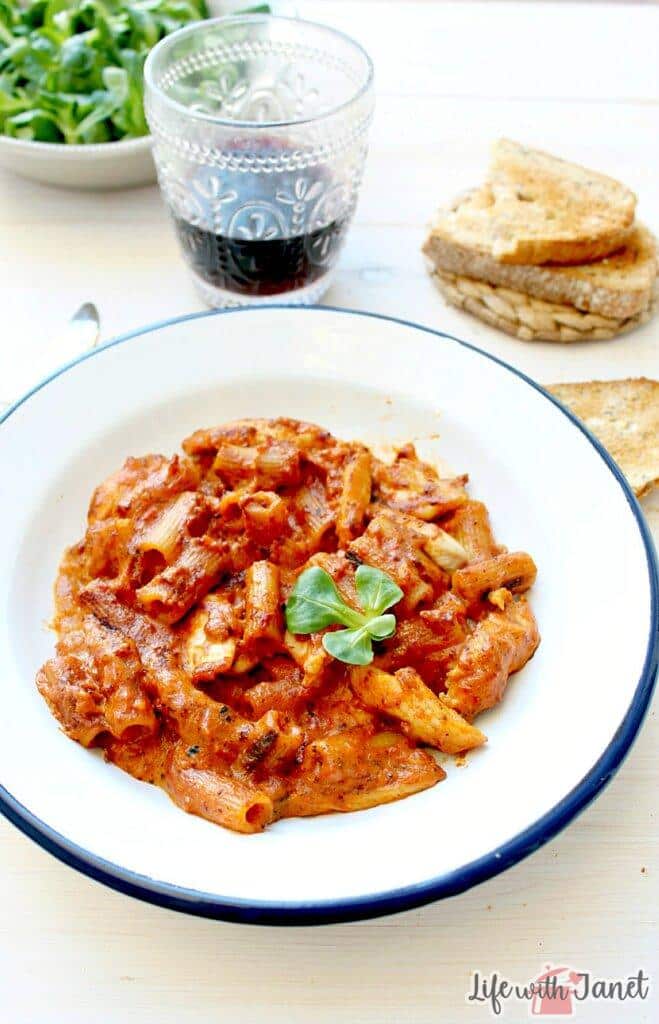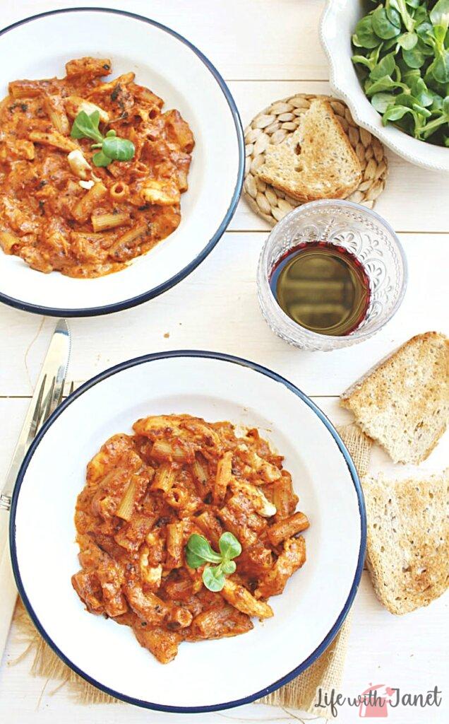 A pretty delicious one, if I may say so myself. We’re talking about tender pieces of chicken and macaroni smothered in a super creamy and smoky red pepper tomato sauce. And then there’s goat cheese, which adds a salty kick and makes the thing even more delicious.