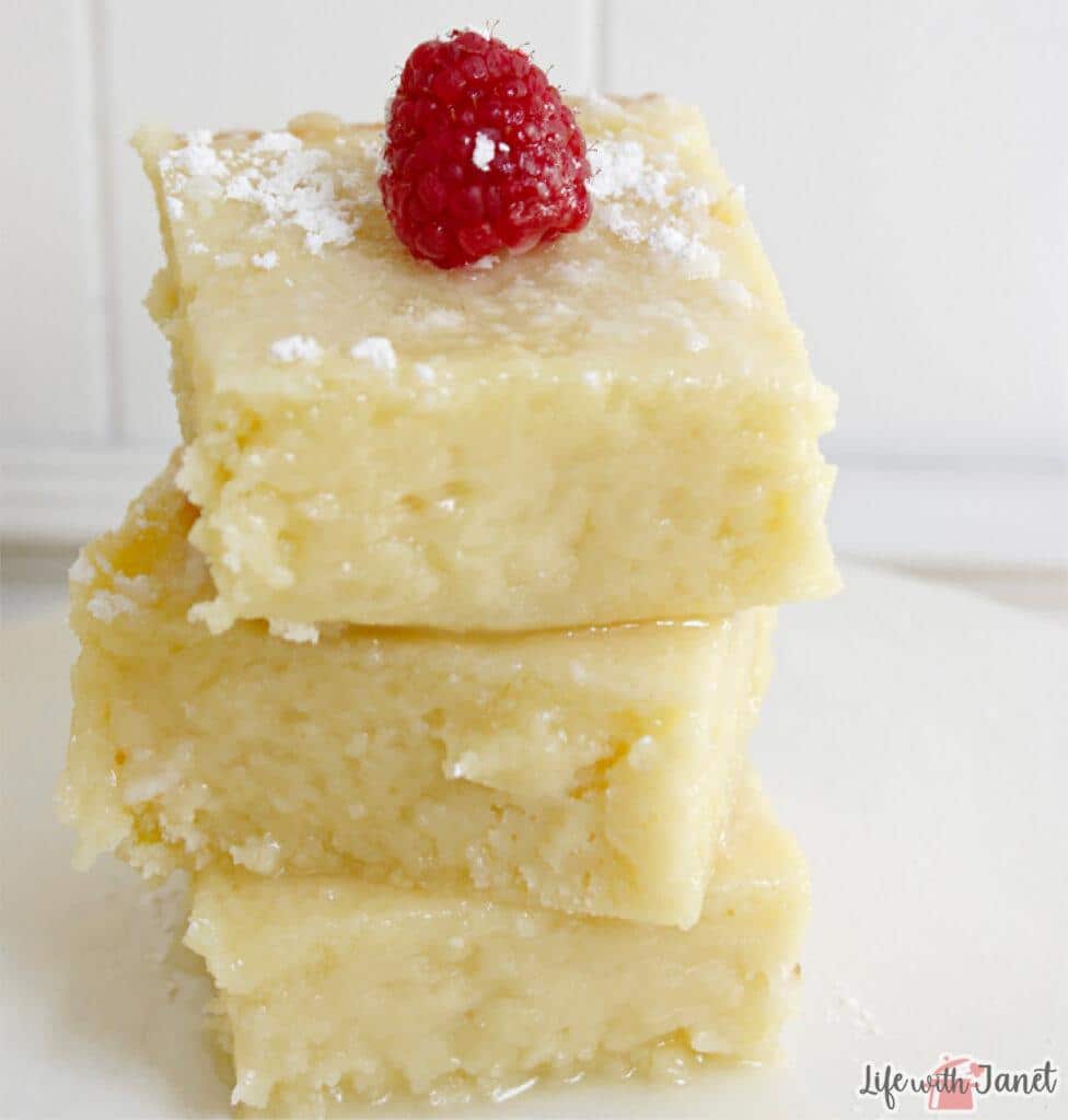 These bars are made with a combination of lemon and white chocolate. After all, they are brownies. And in order to get the right fudgy brownie texture, chocolate had to be involved. Thankfully white chocolate pairs perfectly with lemon, and helps to tame down some of it’s zing.