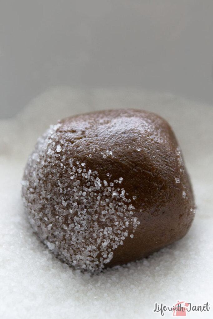 - Scoop dough with a medium food disher (#40 or about 1½ tablespoons) and roll into balls with your hands. Pour about 3 tablespoons granulated sugar into a small bowl. Roll each dough ball in sugar and place on lined baking sheets.