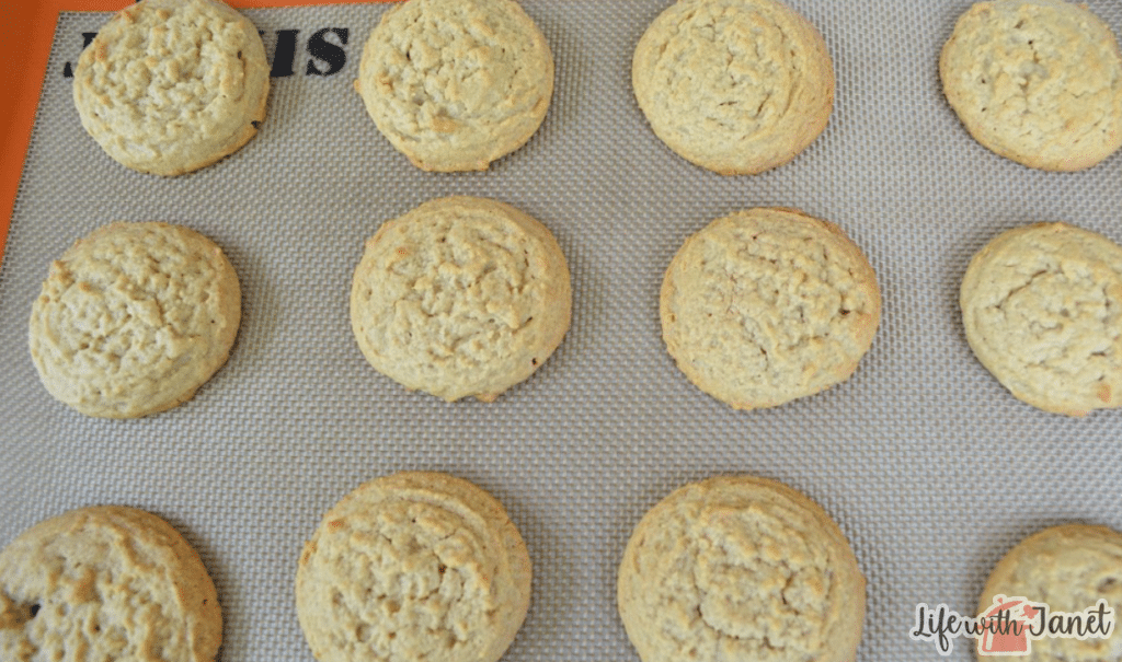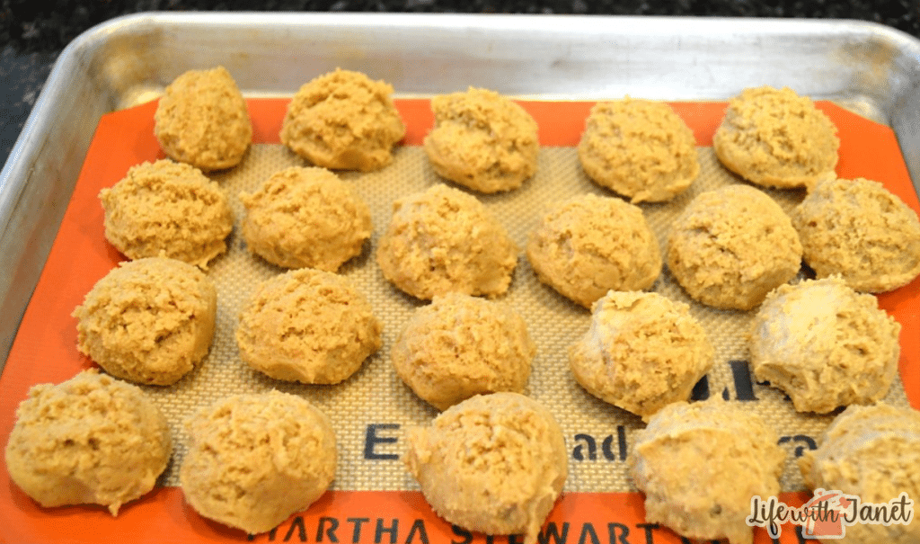 Using a medium cookie scoop, place on a cookie sheet that has been lined with a Silpat or parchment paper. Bake at 325 degrees for 10 to 15 minutes. They should be light golden brown around the edges.