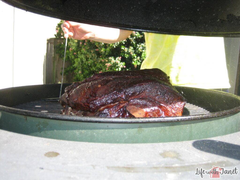 Once he got the grill/smoker up to 225 degrees, he put in the brisket using a drip pan underneath. He did a wet smoke, which means he had a water pan inside, and used something called the minion method that he discovered online a couple of years ago. It basically involves filling the coal basket with fresh charcoal, placing a small number of lit charcoal on top, allowing a continuous burn of the coals and enabling a much longer smoke than filling the entire basket with lit coals. He lifted the lid once an hour to refill the water pan and to add additional coals or mesquite chunks to keep up the smoke and the heat.