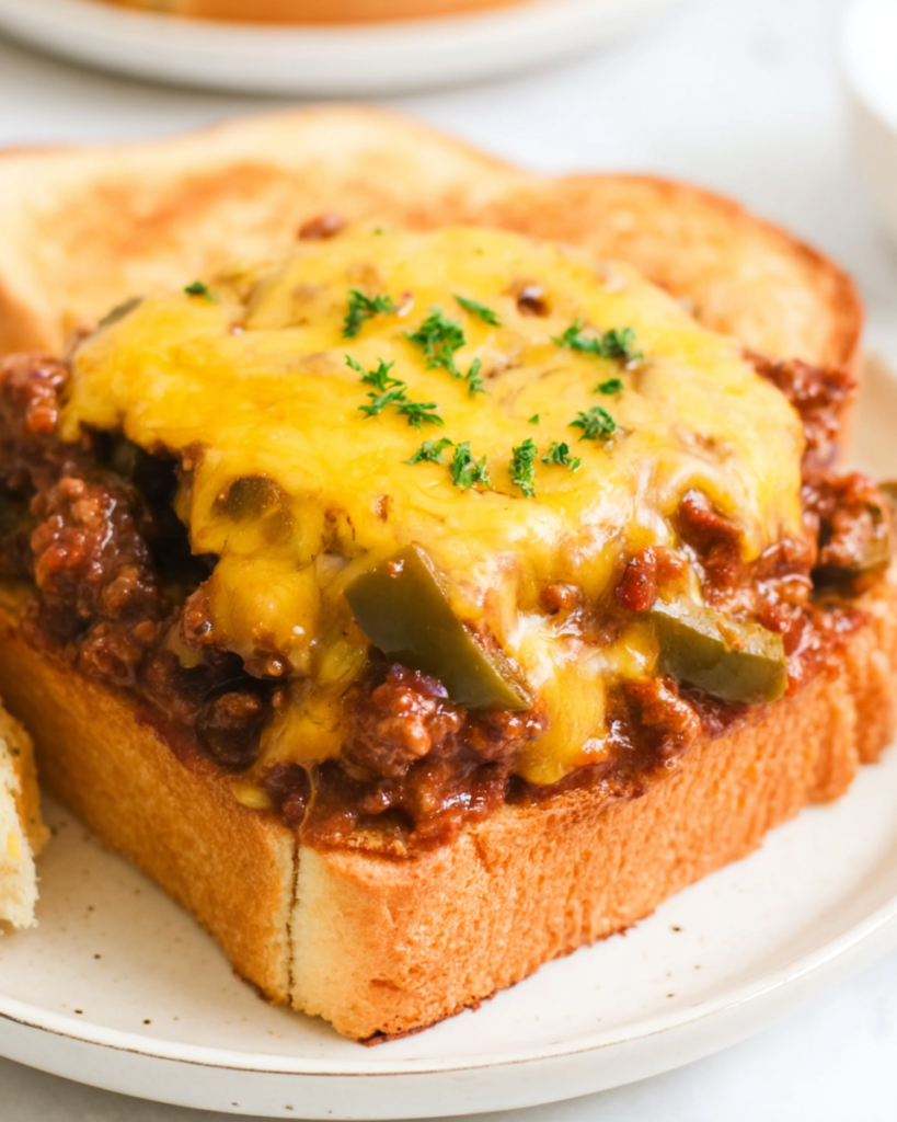 Spoon the hot sloppy joe filling generously over the warm Texas toast slices. Top with shredded cheddar cheese and serve immediately while the toast is still crispy. Enjoy every single bite!