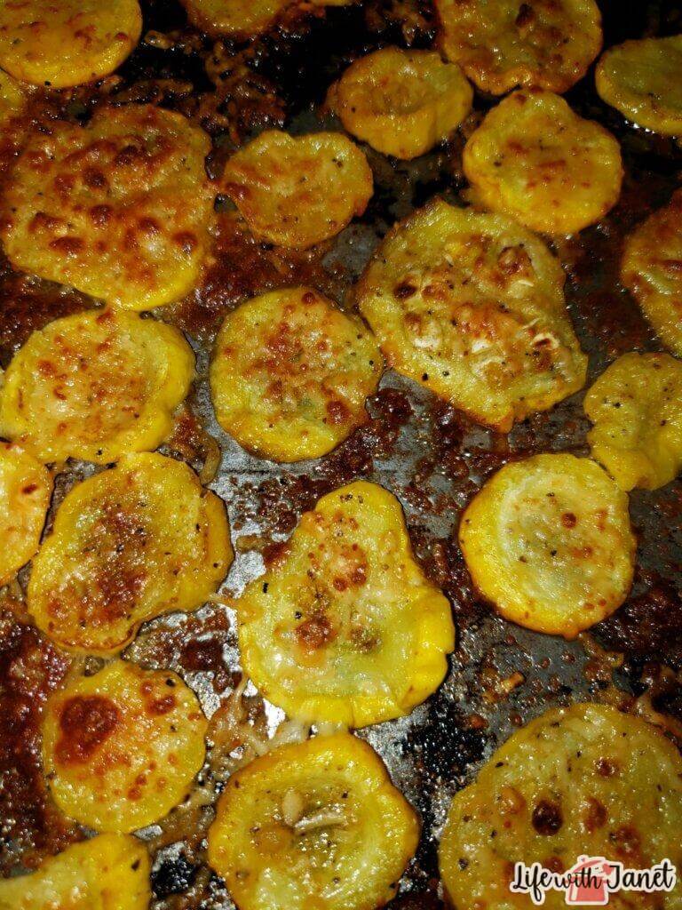 - Time for seasoning! Lightly sprinkle your squash with a dash of garlic salt and a twist of freshly ground black pepper. Then, using a small spoon, spread a thin layer of Parmesan cheese on each slice of squash. Yum!
