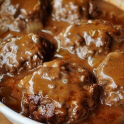 Once that beefy bundle is pan-fried to a glorious golden crown, it’s smothered in a luscious gravy made from condensed cream of mushroom soup thinned out with a splash of water or broth. The entire dish bakes away until that mushroomy elixir has thoroughly infused the patty with soul-stirring, savory succulence.