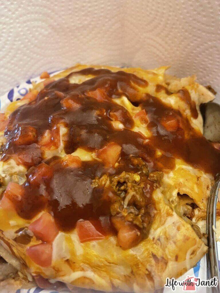 - Building the Pizza: Layer the beans, meat, another tortilla, then sauce, tomatoes, green onions, cheese, olives. Phew! That’s a lot of goodness!