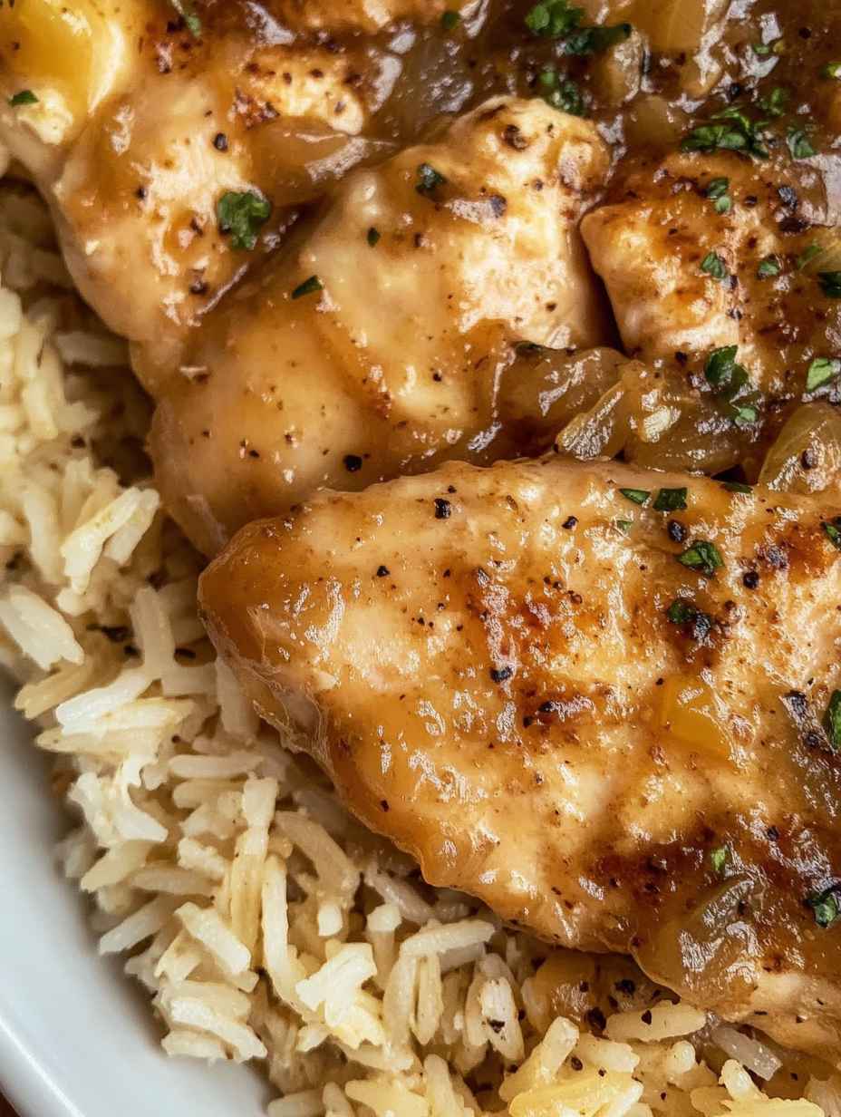 - Season: Sprinkle the onion soup mix over the chicken breasts, then top with the fresh parsley. This adds flavor to the chicken and the rice as it cooks.