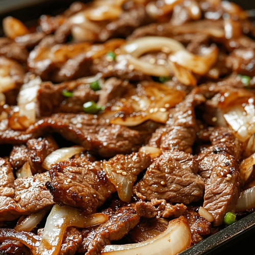 Bulgogi, sometimes called Korean barbecue beef, is a popular Korean dish of thinly sliced, marinated beef. The name literally means “fire meat” in Korean. Traditional bulgogi is grilled, but this recipe is adapted for the oven by using a rimmed baking sheet. Slicing the beef thinly allows it to cook quickly under high heat alongside crisp-tender onions and snap peas.
