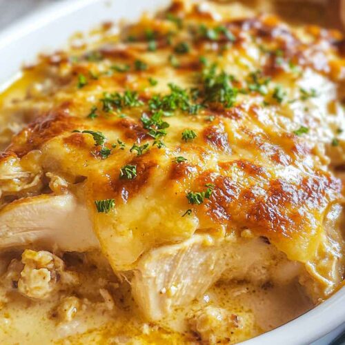 The key is layering flavors and textures. Tender chicken gets a boost from Parmesan, garlic, salt and pepper. Swiss cheese adds melty richness. Then get ready for the creamiest, dreamiest sauce! A simple blend of chicken soup and broth pours right over the chicken and cheese.