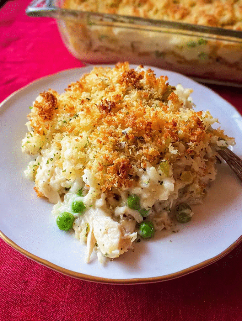 Tender chicken and rice in a homemade garlicky Parmesan cream sauce with peas, topped with a crispy golden breadcrumb crust – comfort food perfection!