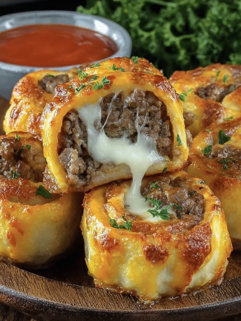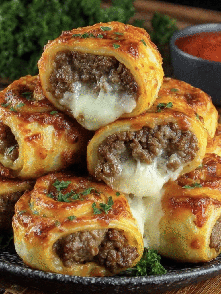 These Garlic Butter Cheeseburger Rollups are absolute genius – all your favourite burger flavours wrapped up in golden, buttery pizza dough with loads of melted cheese!