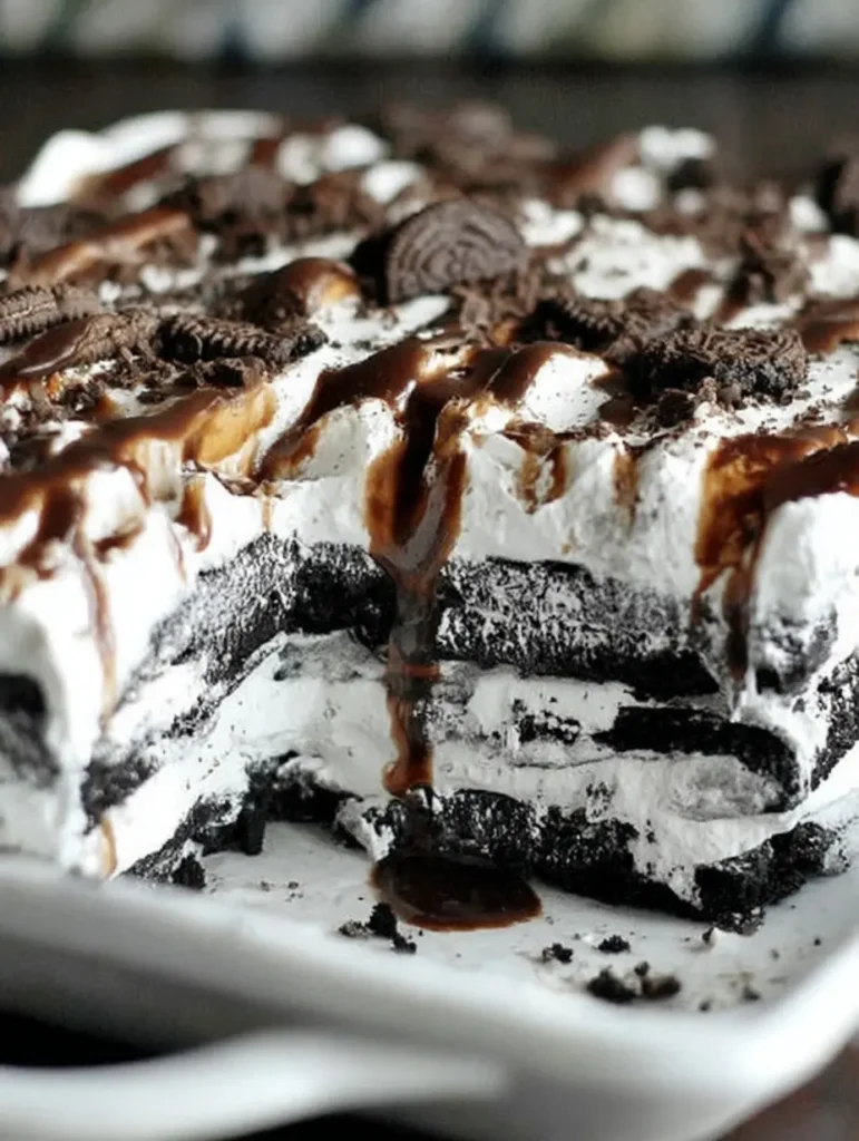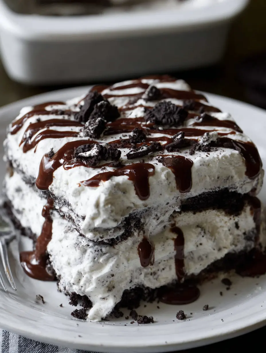 - Your final layer should be Cool Whip. If desired, drizzle with chocolate sauce or sprinkle crushed Oreos on top.