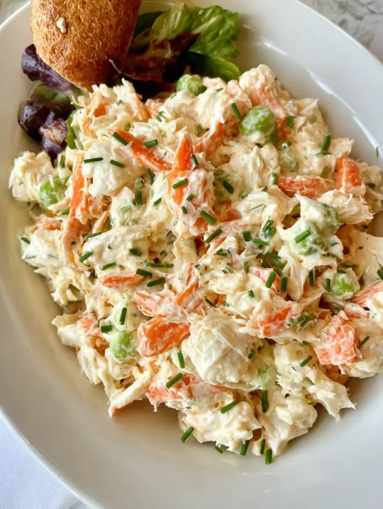 - Break imitation crab into bite-sized chunks and fold gently into the mayo mixture.
