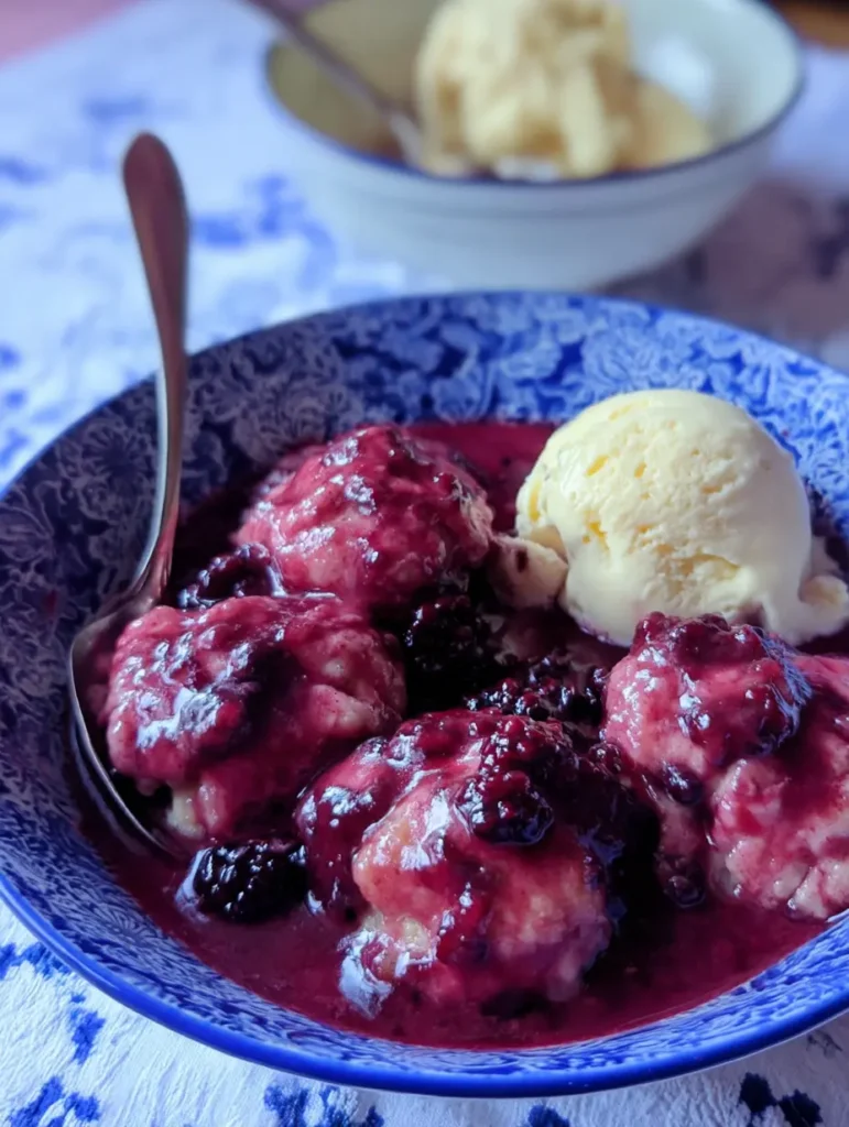 This is more like… berry stew with dumplings? You simmer blackberries with sugar until they break down into thick sauce, then drop pieces of pastry dough right into the bubbling pot. They cook in all that sweet berry liquid and soak up the flavor.