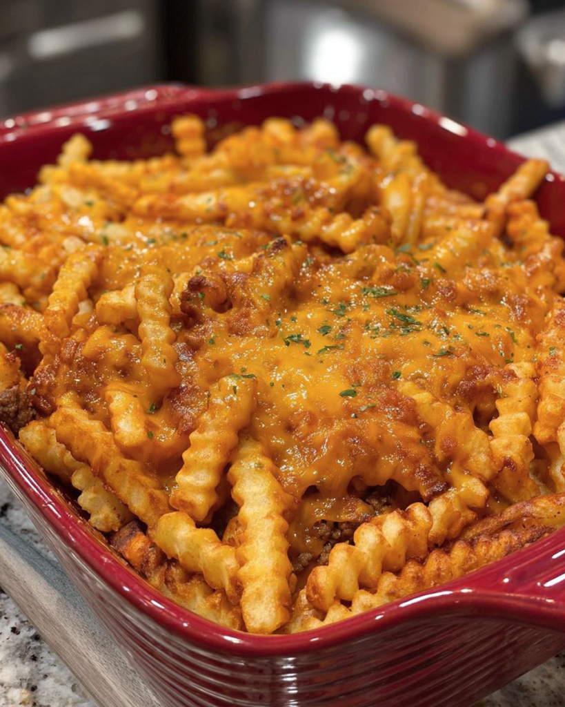 Stick the dish in the oven and bake for about 40 minutes. The fries should be golden and crispy on top.