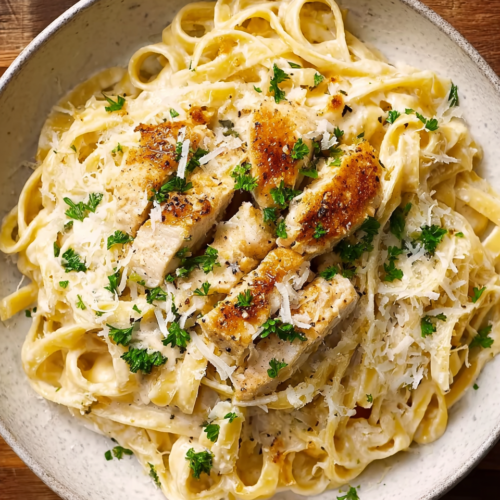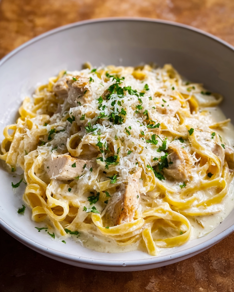 Add the drained fettuccine straight into the sauce and toss it well to coat every strand. Divide it into bowls, lay the sliced chicken on top, and hit it with some extra Parmesan, fresh parsley, and a crack of black pepper. Boom — dinner is served!