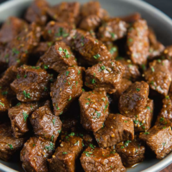 Here’s where it all comes together. Add the beef back into the skillet with the garlic butter. Sprinkle in the garlic powder, onion powder, mustard powder, salt, and pepper. Give everything a good stir so the beef gets coated evenly in all those seasonings. You will smell it immediately — it is a really good sign.