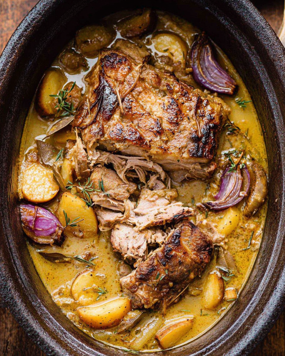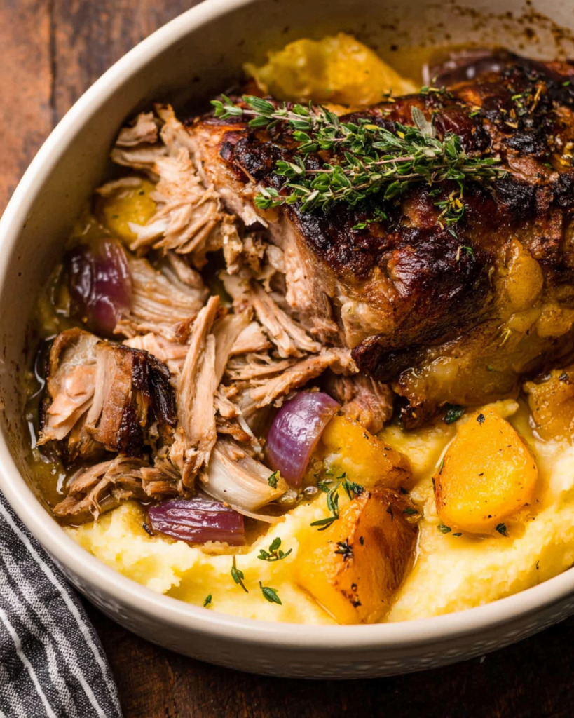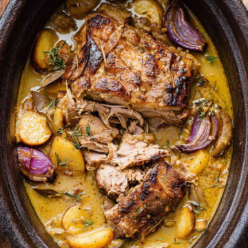 This Slow Cooker Apple Cider Pork Roast is fall-apart tender, packed with warm savory-sweet flavor, and practically makes itself! Juicy pork shoulder braised low and slow in apple cider, garlic, and herbs — served with a rich, glossy pan gravy that is absolutely incredible over mashed potatoes.