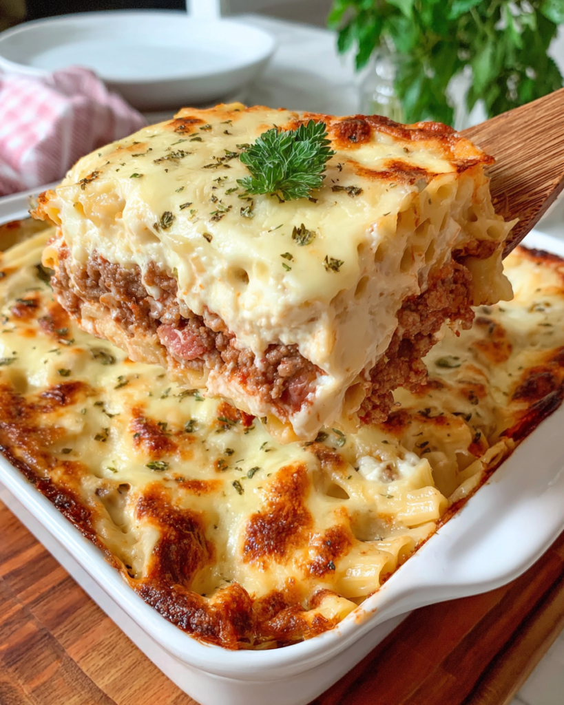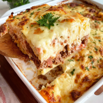 If you have never had Pastitsio before, think of it as the Greek answer to lasagna — only better, in my completely unbiased opinion. There are three distinct layers that all come together beautifully: a simple but incredibly flavorful spiced meat sauce, a layer of thick pasta tossed with cheese, and then that dreamy béchamel on top that bakes up golden and just slightly firm on the outside. It is one of those dishes that looks seriously impressive but is really just a matter of doing things one step at a time. I’m not gonna lie — it does take a little time, but every single minute is worth it. This is the kind of meal that has people going back for seconds and thirds, and asking you for the recipe before they even finish their plate!
